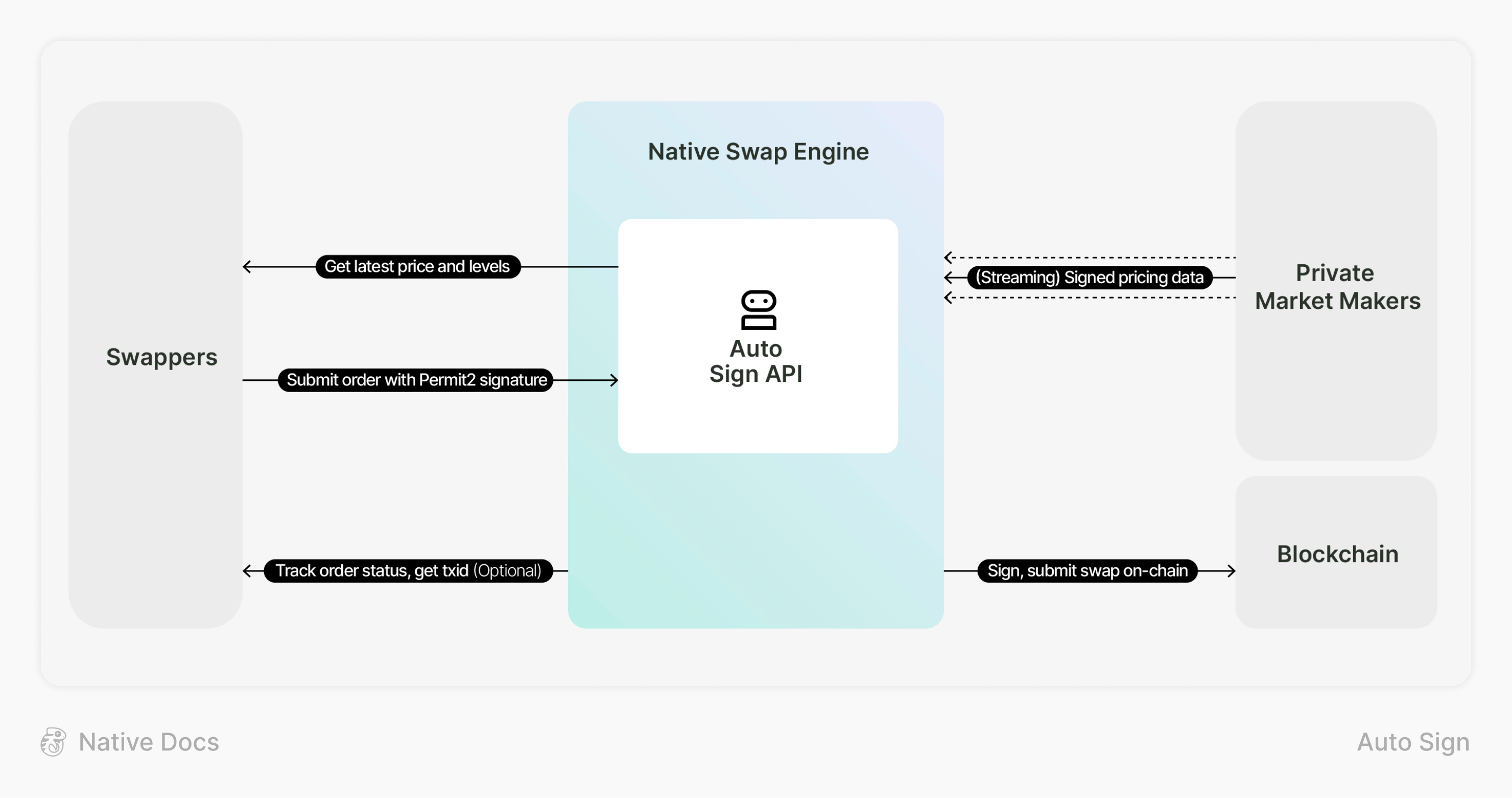 2. Swappers submit the swap order to the auto-sign endpoint with parameters such as the amount, token addresses, and the required `permit2` signature for the Native Swap Engine.