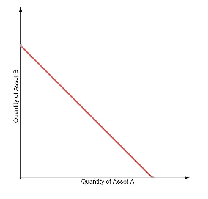 Where R_i are the reserves of each asset and k is a constant. While this function produces โzero slippageโ, it does not provide infinite liquidity and thus is likely unfit as a standalone implementation for a decentralized exchange use-case. In practice, what would happen is that any arbitrageur would always drain one of the reserves if the reference relative price of the reserve tokens is not one.